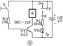 继电器电路 见图9 。继电器K选用JRC—21F等超小型弱功率电磁继电器,线圈电压选6V,消耗功率0.36W。由于继电器线圈工作电流60mA,比玩具电动机工作电流小,比蜂鸣器、发光二极管工作电流大,因此设计电路时各元件参数介于两者之间,图中参数供参考。在图9继电器电路中,F为衔铁,D为常闭触点,E为常开触点。当控制开关S闭合时,继电器吸合,常开触点F-E接通,发光二极管VD1点亮,R2为限流电阻器。图9控制开关S换成干簧管开关、双金属复片开关,就可以进行磁控和热控自动控制了。继电器触点可以根据需要选用常开或常闭触点。由于继电器触点与传感控制电路隔离,选用JRX型继电器,其触点可以接220V交流电,直接驱动交流电用电器。这些简单的自动控制器有什么用途呢?比如,利用荧(日)光灯中启辉器中的双金属复片,改制成可控温度传感器,制作成简易电子恒温箱、酸奶器,甚至炕头孵化鸡蛋的过热、过冷报警器等。 继电器自动控制电路 如图10~12所示。其中,图10为继电器光控电路,图11为继电器湿度控制电路,图12为继电器压力控制电路。在图12中,BZ为压电陶瓷片,此时做为压力传感器,敲击时能够产生正、负尖顶脉冲电信号,加到控制电路输入端,二极管VD1为负尖顶脉冲电流提供通路。电阻器R1和电容器C1组成充放电电路,以增加正向脉冲宽度,延长继电器吸合的时间。实验时,对压电陶瓷片突然施加或减少压力时,继电器都会吸合、发光二极管点亮一次。如果将图12改装成声控电路,还需要把压电陶瓷片声音传感器产生微弱的电信号进行放大,才能够驱动继电器电路工作。